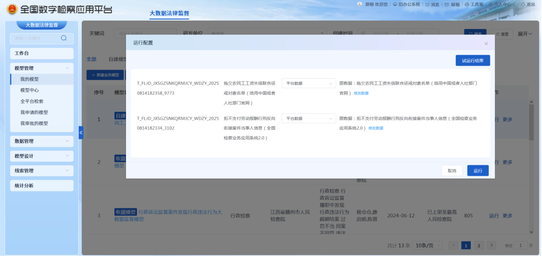 在全国检察业务应用系统2.0中,以“拒不支付劳动报酬”为关键词进行检索,筛选出 2022 年以来的拒不支付劳动报酬行刑反向衔接案件当事人身份信息;在信用中国、人社部门官网等平台获取公示的拖欠农民工工资失信联合惩戒对象名单,将上述两项数据进行碰撞比对,得到应当将用人单位列入拖欠农民工工资失信联合惩戒对象名单而未列入的数据,并将其作为疑似监督线索,进行线下核查。
