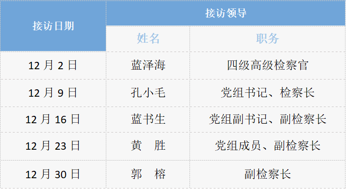 温馨提示:如若接访领导因工作冲突或其他特殊情况不能参与当天的接待日接访活动,我院将会根据实际情况安排其他领导接访。
