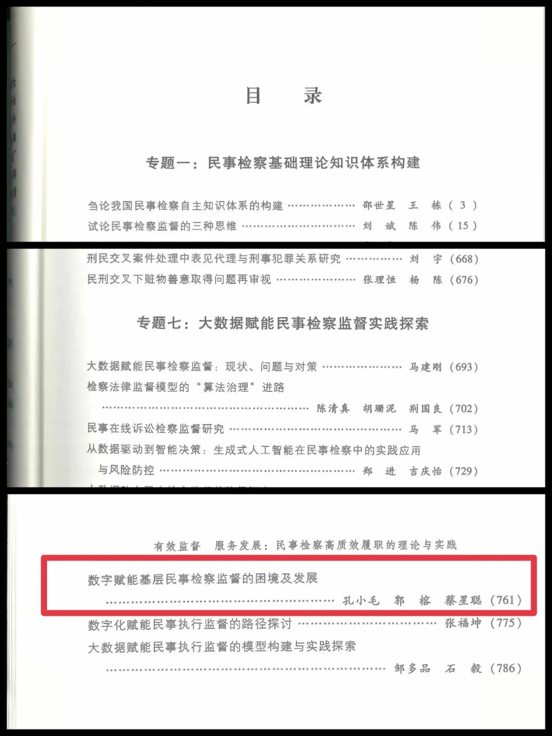 近日,由南康区人民检察院党组书记、检察长孔小毛,副检察长郭榕和第四检察部四级检察官助理蔡星聪撰写的理论文章《数字赋能基层民事检察监督的困境及发展》,入选最高人民检察院举办的第十八届国家高级检察官(“有效监督 服务发展——民事检察高质效履职的理论与实践”主题)论坛论文集。