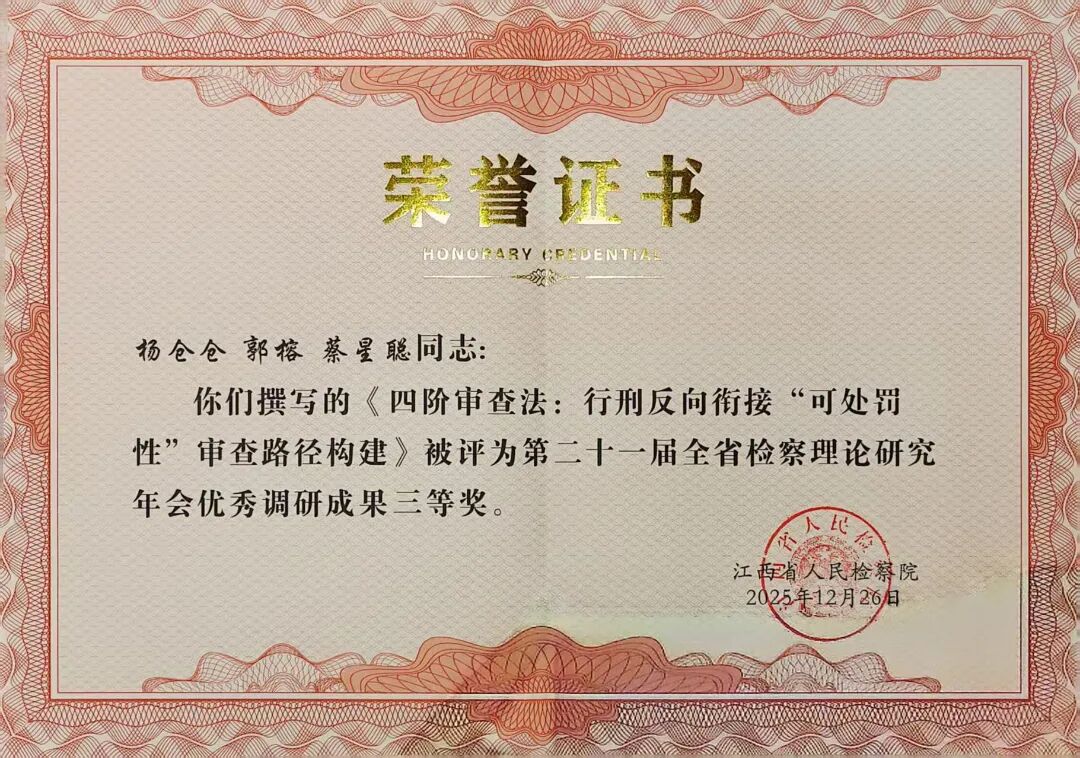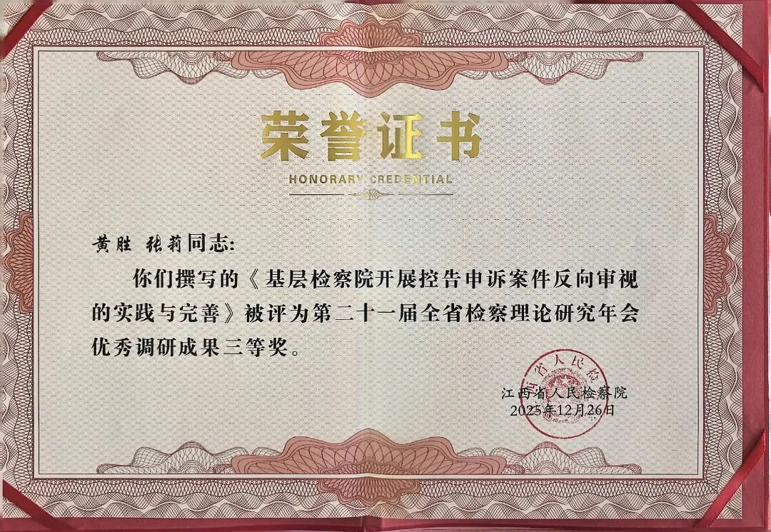 2025年12月30日,江西省人民检察院在上饶组织召开第二十一届全省检察理论研究年会。此次年会上,南康区检察院再创佳绩,共有4篇理论研究成果脱颖而出,荣获表彰!