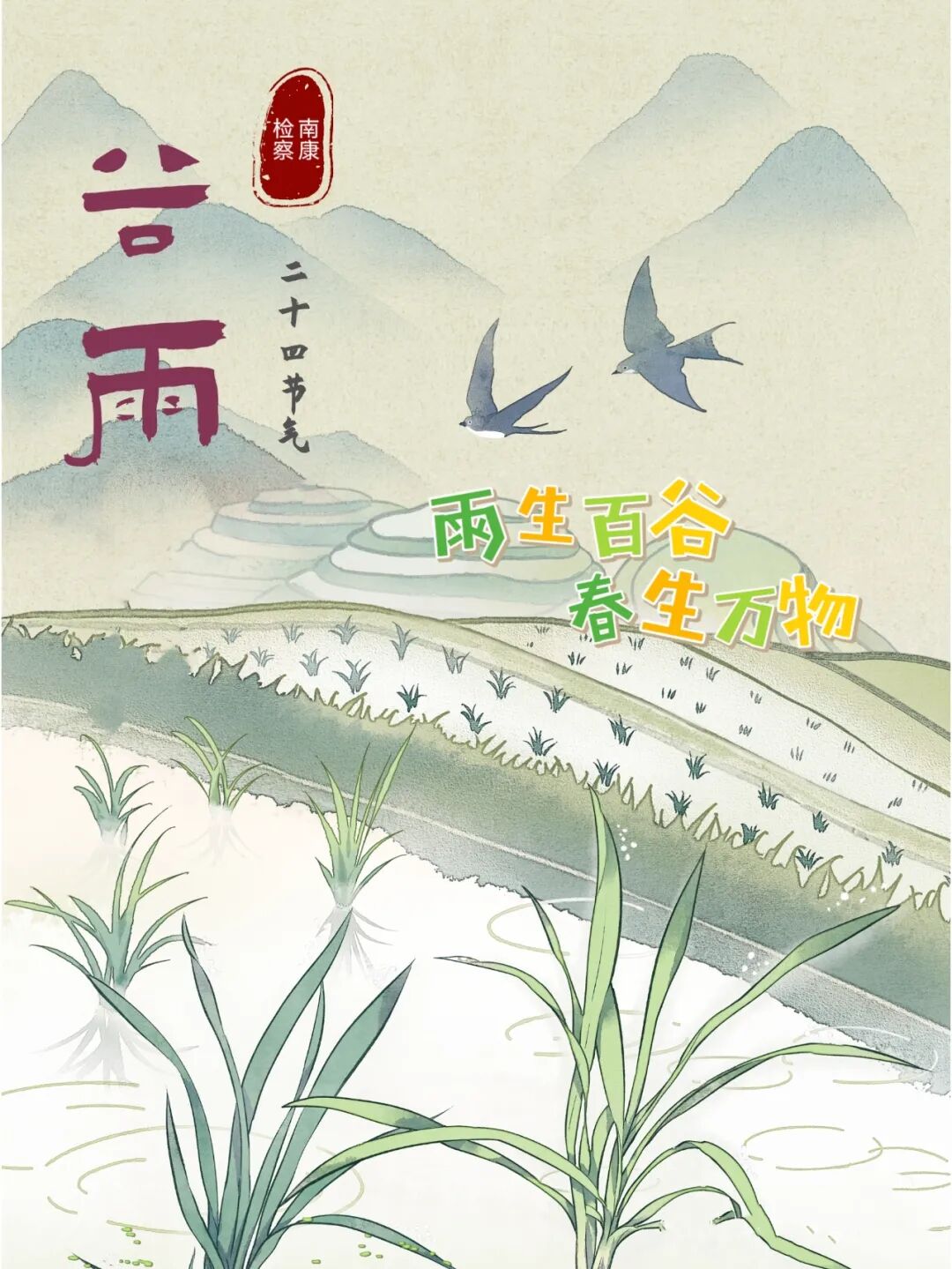 谷雨至,雨生百谷,清净明洁。谷雨时节,春夏交接,田中秧苗初插、作物新种,最需要雨水的滋润,意味着新的生机与希望。“好雨生百谷,谷雨润万物”,广大党员干部,要趁着谷雨节气,播下智慧、实干、廉洁的种子,向光生长、向廉而行,静下心来勤学习,沉下身子尽好责,在新时代、新征程披荆斩棘,一往无前,勇立新功。
