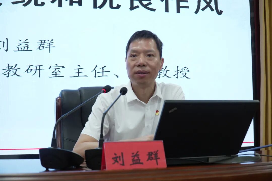 课上,刘益群教授用生动幽默的语言,从“对党忠诚”、“理论联系实际”、“人民至上”、“批评与自我批评”、“敢于斗争”、“艰苦奋斗”等六个方面,深入浅出地阐述了党的光荣传统和优良作风的丰富内涵、实践意义和时代价值,既有理论高度、思想深度,又有历史厚度和实践广度,切实教育引导全院干警继承党的光荣传统,发扬党的优良作风,做新时代对党忠诚的检察人。